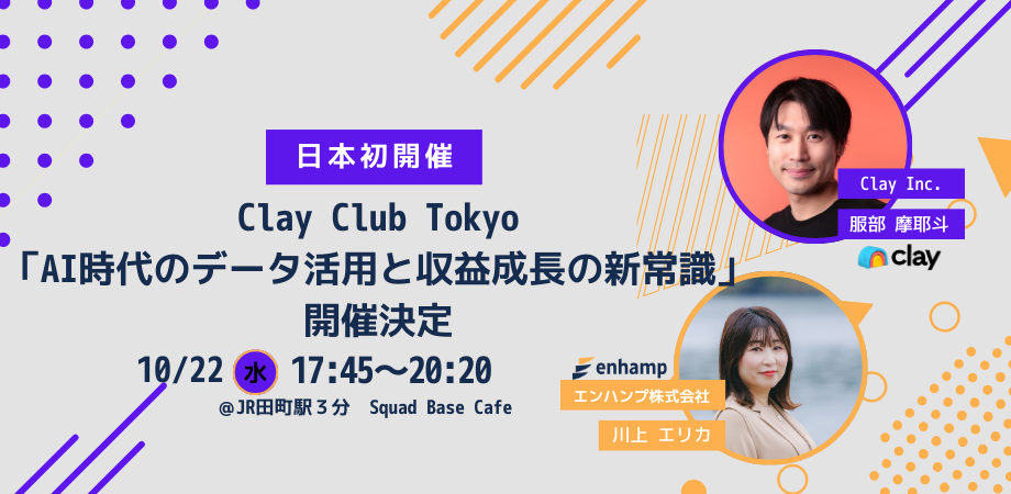 RevOps領域のコンサルティングと人材育成サービスを展開するエンハンプ株式会社(本社:東京都中央区、代表取締役:川上エリカ)は、日本初となるイベント「Clay Club Tokyo」を2025年10月22日(水)、東京都港区にて共同主催いたします。テーマは「AI時代におけるデータ活用と収益成長の新モデル」です。